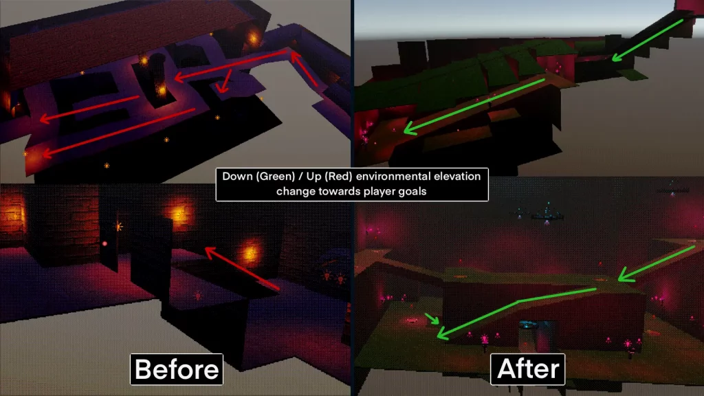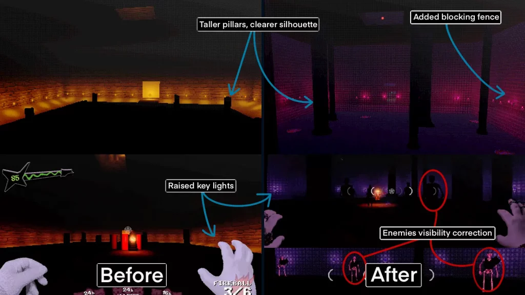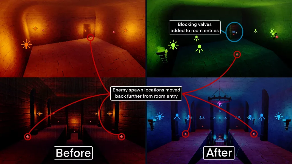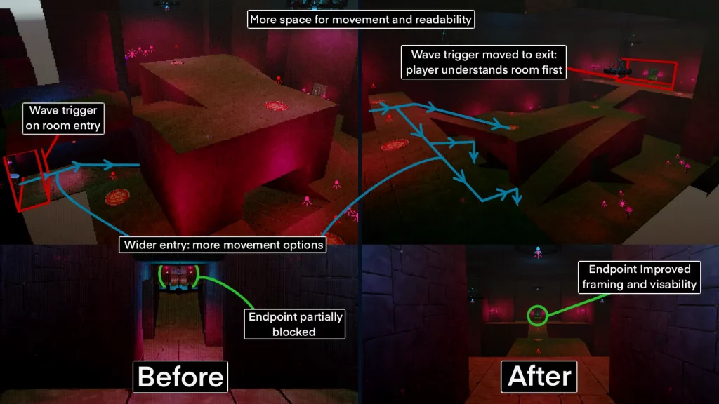 Iterating on spawn placement, stagger timing, and gating reduced overwhelm and encouraged players to engage with the space rather than rely on doorway choke-points. - Lighting consistency required both rules and repeatable testing.